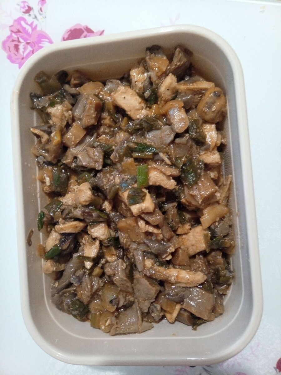 Элементарное писать не буду. Начну сразу с заготовок: грудку или другие части режем тонкими пластинами. Вешенки режем крупными квадратами. Зелёный лук мелко. В глубокой тарелке: сахар, крахмал,кетчуп,соль и соевый соус- смешиваем. Получится густая как кисель жидкость. Теперь режем всё филе одинаковыми полосками и выкладываем на разогретую сковороду с небольшим количеством масла.На большом огне быстро обжариваем с 2х сторон по 2-3 мин( чтобы запечатать сок внутри!). Жарим не все сразу,а частями!! Перекладывает ее в тарелку. Нарезанные (не мельчим!) вешенки,жарим на горячей сковороде с 1 ложкой масла. Перекладывает в тарелку. В сковороду +1 ложка масла и выдавливает или мелко рубим чеснок и добавляем сюда нарезанный лук,обжариваем на среднем огне. ОСТОРОЖНО!!! НЕ ДАЙТЕ СГОРЕТЬ!! + вешенки и мясо, перемешать и + имбирь,соус и тугим не мешая 2-3 мин. Блюдо готово !! Так можно заменить грибы шиитаке...😉