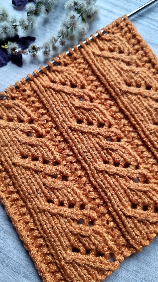 Какой эффектный узор получился из пары ажурных рядов. Красивые вертикальные секции с незаурядными косыми линиями с дырочками.