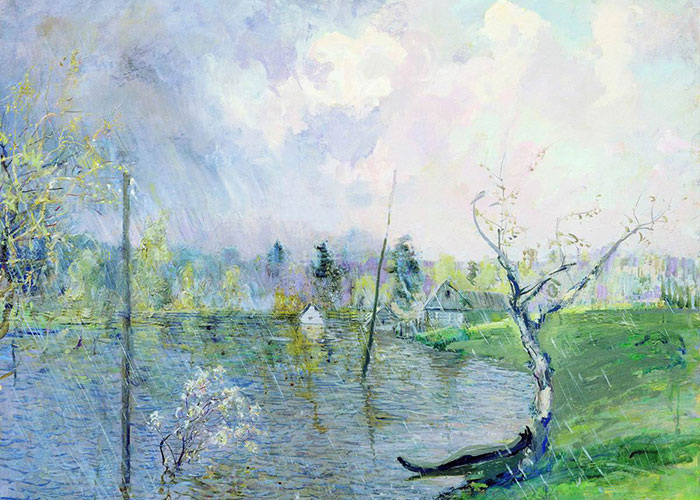 Отгремели в дымных тучах разыгравшиеся громы, Отблистали молний жгучих быстролетные изломы, Вырывайся, как лава, струйкой яркою, нежданно Из расщелин и из трещин огнедышащих вулкана; И весенний дождь веселый голубыми полосами Пал на нивы и на долы, окаймленные лесами, Пал счастливыми слезами первой страсти, вешней страсти, У которой все богатства, вся вселенная во власти. Зашептался, засмеялся дождь в саду моем зеленом, Каждый листик отозвался вздохом, трепетом иль звоном... Сад стоял в цвету, подобно новобрачной у порога, Осыпаемый, как хмелем, благодатью щедрой бога. Дождь прошел с улыбкой вешней. Сад умолк и притаился, Точно он душой безгрешной благодарственно молился, И по небу, из-за тучи с серебристыми краями, Еле спрятанное солнце разбежалося лучами. Александр Митрофанович Фёдоров, 1898 год Источник