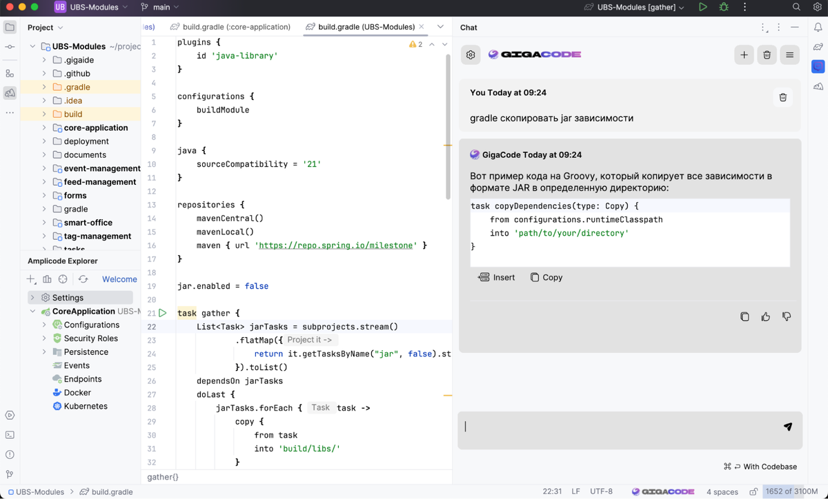 Привет, backend разработчик Natlex Александр тестил в своей работе GigaIDE и делится плюсами и минусами этой системы. Если вас интересует ИТ-разработка, наш опыт работы и то, как мы помогаем клиентам превращать идеи в цифровые продукты, будем рады видеть в нашем ТГ-канале. IDE (от англ. Integrated Development Environment) — это интегрированная среда разработки или программа, в которой разработчики пишут, проверяют, тестируют и запускают код, ведут большие проекты. IDE включает в себя несколько инструментов: редактор для написания кода, сервисы для его проверки и запуска, расширения для решения дополнительных задач разработки. Недавно Сбер выпустил свое десктопное IDE решение GigaIDE на базе IDEA, хочу рассказать об опыте работы с ним. Работает. Даже вполне хорошо для решения текущих задач. Получилось достаточно быстро перейти с IDEA Ultimate, так как у последней, была заблокирована работа по лицензии на территории РФ.