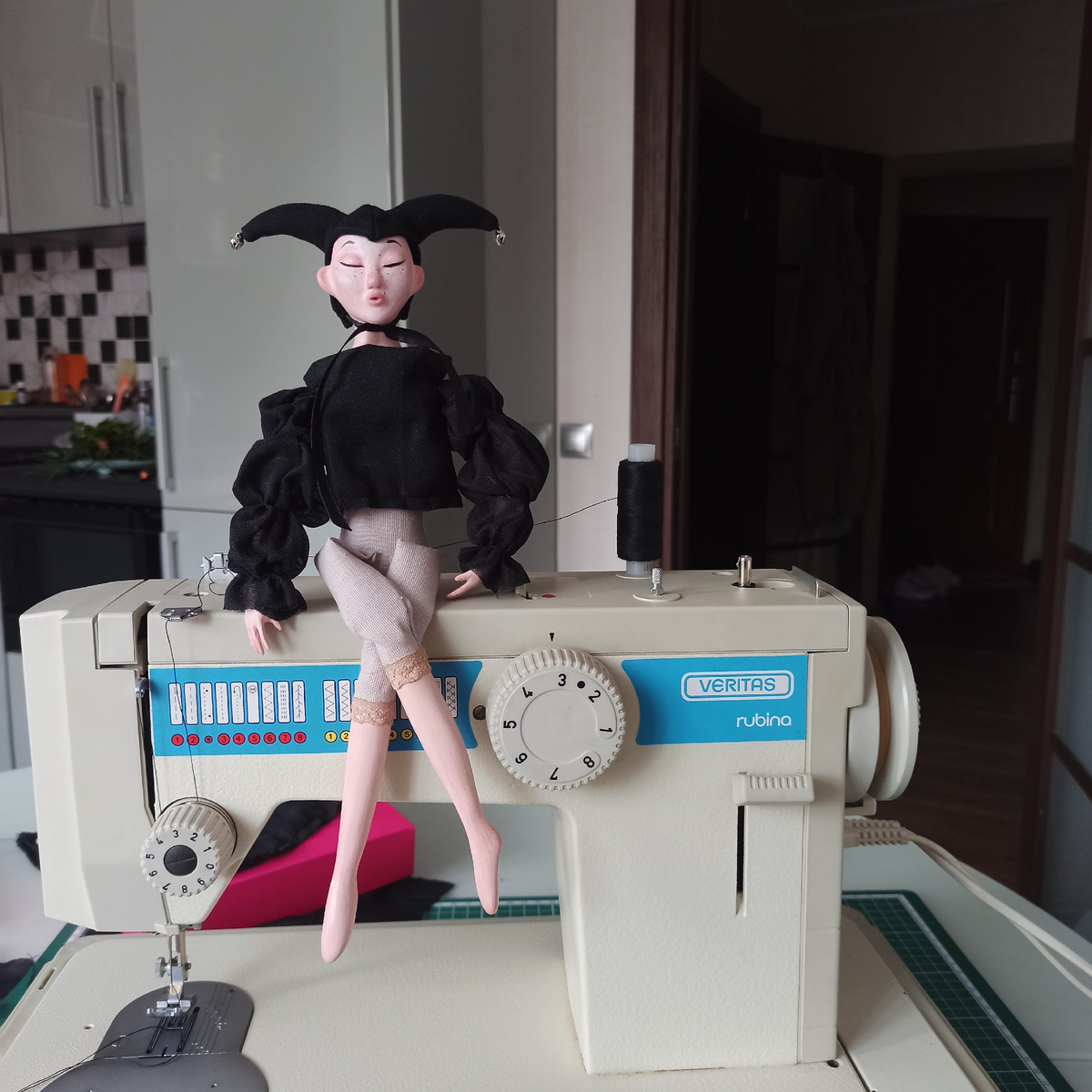 Начало тут Итак я обещала рассказать про костюм и показать финальный результат. Спустя больше полу года я доделала эту куклу. Конечно же, если считать чистые дни создания думаю наберется неделя максимум. Сначала у меня был поиск референсов, я и куклу загорелась сделать только из-за того, что сидела на пинтерест и увидела, что делают мастера. Выбор пал на цирковую тематику, ну люблю я это, не могу! Особенно винтажный! А основа цирка для меня это смешные головные уборы. Я замахнулась сразу на самое сложное - шутовской колпак. Переделывала его три раза! Сначала рога были слишком толстые, потом сама шапочка маловата, хотя рожки идеальны. Затем, когда появился полосатый корсет, мне захотелось "поддержать" его полосками в головном уборе - и так появилась третья версия колпака! Сложная конструкция, но красивая. Так как я изначально хотела делать черно-белый наряд, то нужно было разнообразить фактуры тканей, чтобы все не слилось в единое черное пятно. Блузку выбрала шить из тонкого материала