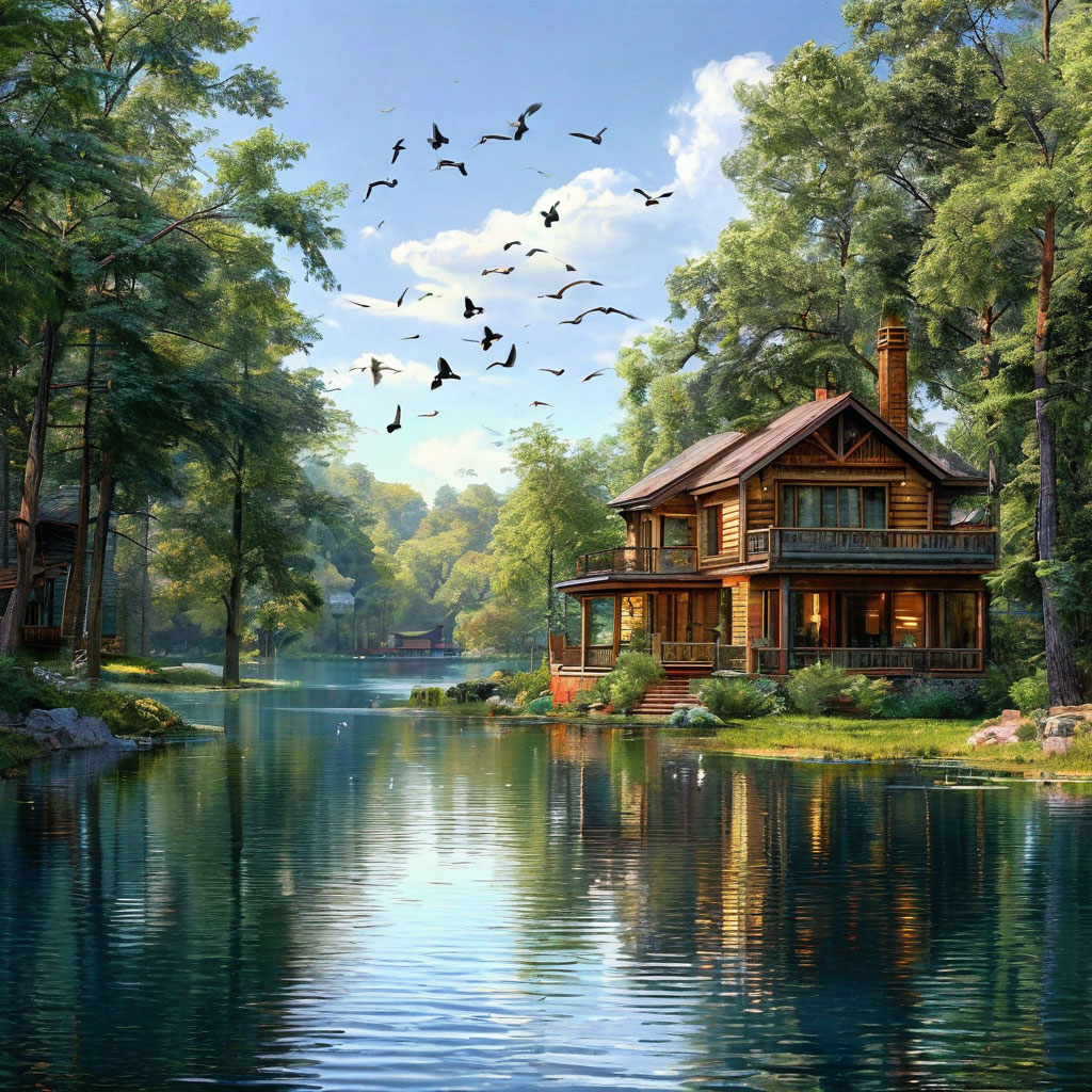 Уютный домик на берегу озера, окруженный пышными зелеными деревьями. Птицы летают над водой, создавая гармоничное и спокойное настроение.