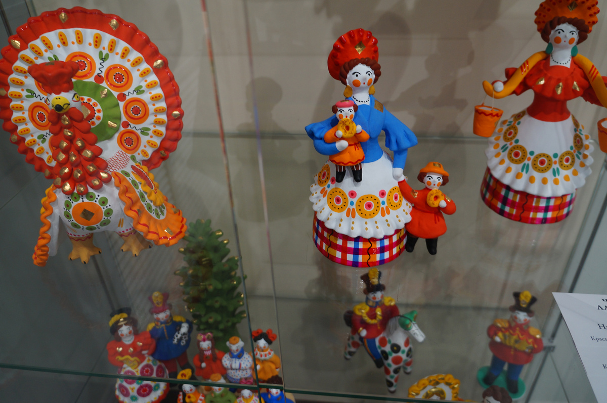 Дымковская игрушка - яркая жизнерадостная, зародилась в Вятской земле, суровом северном крае. Игрушка как бы впитала в себя солнце и яркие краски короткого вятского лета. Изготавливается исключительно вручную терпеливыми мастерицами. Получила название по слободе Дымково в вятском заречье. Для производства дымковской игрушки используется местная ярко-красная глина, перемешанная с мелким речным песком. Фигурки лепят по частям, слепливая их в целиковую игрушку. Затем игрушка сохнет несколько дней и обжигается при температуре 700-900 градусов. После обжига фигурки покрываются белилами и расписываются анилиновыми красками. Наиболее распространенные сюжеты - барыни, индюки, барыни с коромыслом, олени, парные фигурки. Дымковские игрушки воплощают образы людей, животных и сказочных персонажей, отражая быт и праздники русского народа.