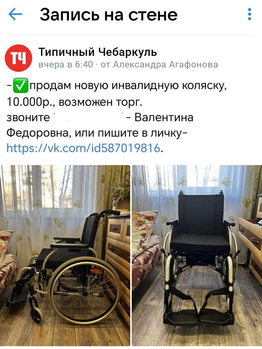 Потому что по-другому это назвать нельзя 🪄✨💫 После того как я написала статью по поводу того, что у меня сломались тормоза на моей механической коляске Я связалась с сервисной службой. На мой запрос мне ответили, что один тормоз будет стоить 1200 р. Доставка 1263 р. Ясное дело, что если менять тормоз, то лучше сразу оба. Вот и получается 3663 р 🤔 Я сразу вспомнила, что за 5000 р я три года назад целую коляску продавала... На Маркете с купоном можно было заказать таки один тормоз за 1700 р. Но ждать примерно 9 дней. Я немного расстроилась и пошла гулять по контакту. Всегда смотрю страничку нашего города. Типичный Чебаркуль. Листаю, листаю и вижу объявление. Куй железо пока горячо! Я тут же набираю телефон и спрашиваю про ширину сиденья на этой коляске. Хозяйка сказала, что сейчас измерит и мне перезвонит. Перезвонила и говорит 42,5-43 см. Радости моей просто не было предела. Уточнила, что коляска совершенно новая. Так же, как мне тогда три года назад выдали женщине 2 коля