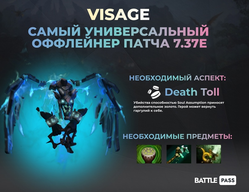 После добавление аспекта Death Toll герой нашего сегодняшнего гайда стал одним из самых сильных оффлейнеров, и в том числе благодаря ему Team Liquid смогли выиграть TI 13. Хоть с того времени и выпустили уже 2 патча, но герой все еще является одним из лучших для поднятия рейтинга. В начале игры у Visage очень много урона, есть контроль от птиц, высокая стойкость, если замаксили пассивку, из-за чего против него тяжело драться. У нашего героя наверное самые неинтуитивные способности, о работе которых не все знают даже на сравнительно высоком рейтинге. Самое главное, о чем нужно думать при пике Visage, — чтобы вас не загнобили на линии, поэтому рекомендуем брать вам пикать героя, когда видите у себя 4ку, которая может наносить много урона, например: Hoodwink, Techies, Dark Willow или с сильным милишником: Marci, Tusk. С кем Visage хорошо стоит линию, мы уже определилсь. Что касается остальной игры: Что по контрпикам? Как бы это не было очевидно, но висаж не любит тех, кто обладает АоЕ уро