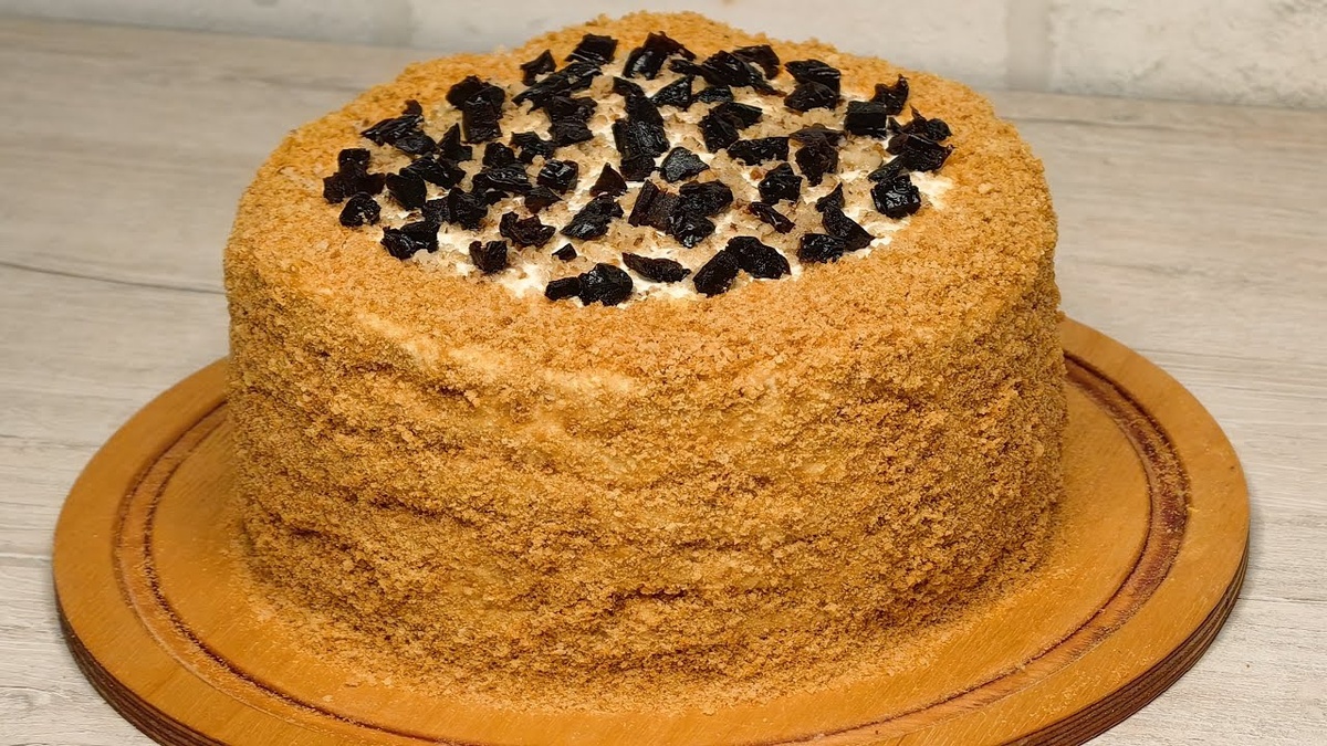 На блюдо выкладываем корж, промазываем кремом, посыпаем измельчёнными орехами, сверху выкладываем чернослив и накрываем ещё один корж. Так проделываем пока не закончатся коржи.