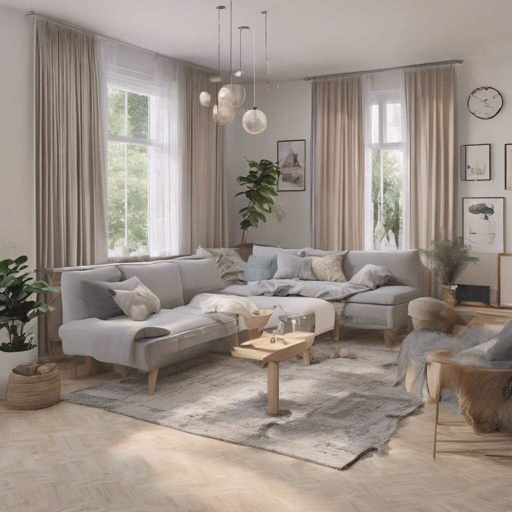 Оконные рамы чаще всего окрашивают в белый, черный или в цвет пола. Если в квартире установлены панорамные окна, то в датском стиле это только приветствуется, т.к. они позволяют впустить в помещение как можно больше естественного света. Для этой же цели обычные окна зачастую никак не оформляются. Однако при необходимости их все-таки можно декорировать воздушным тюлем, рулонными шторами, а также шторами из хлопка или льна.