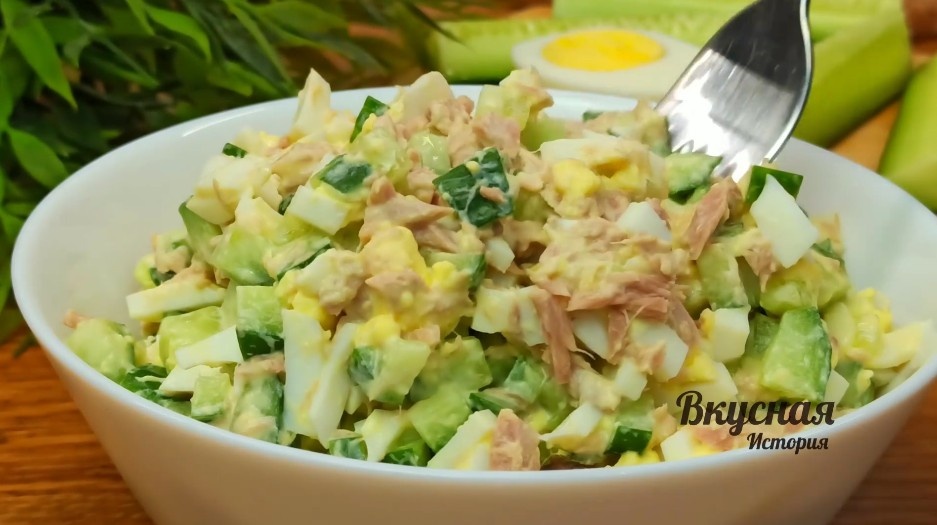 Всем здравствуйте. Иногда на обед не хочется плотно есть, а хочется чего-нибудь легкого но сытного. У меня есть несколько вариантов, простых и быстрых в приготовлении салатов. При этом они сытные и есть не хочется до ужина. Обычно у меня в холодильнике всегда есть вареные яйца, люблю на завтрак их есть, или салат удобно на скорую руку сделать. Поэтому на приготовление такого салата трачу буквально пять минут. Этот салат легко приготовить, что делает его идеальным выбором для быстрого обеда или даже ужина. Очень сытный, вкусный и сочный салатик получается. Список ингредиентов и видео, вы найдете в конце⤵ Яйца я отварила заранее. Нарезала кубиками. Все ингредиенты отправляю в миску. Огурец нарезаю кубиками. Тунец нарезаю кусочками, можно просто размять вилкой. Чтобы салат был не слишком калорийным, беру тунец консервированный в воде. Солю по вкусу, но можно и без соли обойтись. Добавляю две столовые ложки майонеза и перемешиваю. Салатик готов. По желанию к нему можно добавить: черный мо