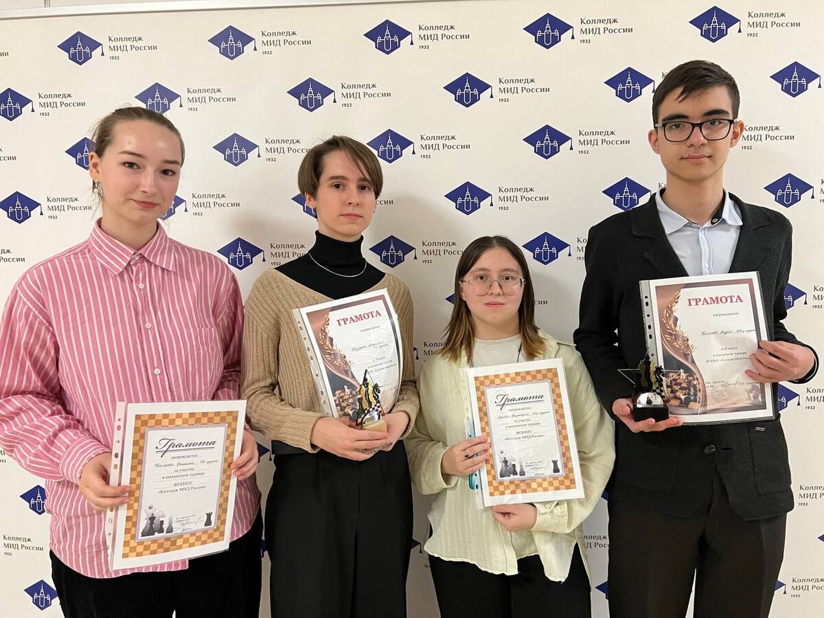 В Колледже прошло первенство по шахматам среди студентов 1 курса. 6 студентов приняли участие в нем. Места распределились следующим образом: I место - Жихарев Матвей (914ю группа); II место - Климов Андрей (912ц группа); III место - Назарова Анастасия (912 группа). Всем студентам (призерам и участникам) объявлена благодарность с повышением рейтинга!