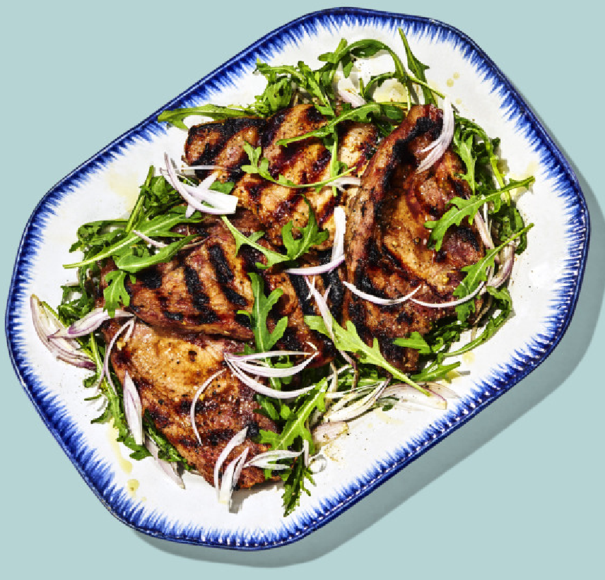 Тонко нарезанные пласты свинины без косточек идеально подходят для этого вкусного маринада, так как быстро готовятся и впитывают его. Просто при приготовлении на гриле постоянно присматривайте за ними, чтобы предотвратить пережарку. На 6-8 порций: - 10 мелко натёртых чесночных долек - 1 стакан французской горчицы - 1 стакан мёда - 3 / 4 стакана имбирного пива - 2 чайные ложки кошерной соли Diamond Crystal или 1 + 1 / 4 чайной ложки кошерной соли Morton - 1 столовая ложка и ещё немного свежемолотого перца - 680 грамм центральной вырезки свинины (примерно 10 пластов, толщиной 6 мм — 1.2 см) - растительное масло (для гриля) - 1 стакан молодых листьев рукколы (разделённых; стакан наполнен ими не плотно) - 1 тонко нарезанный лук-шалот - оливковое масло высшего качества (для обрызгивания сверху) - хлопьевидная морская соль Перемешайте чеснок, горчицу, мёд, имбирное пиво, кошерную соль и 1 столовую ложку перца в 4л пластиковом пакете или в большой закрывающейся посуде. Добавьте в маринад свин