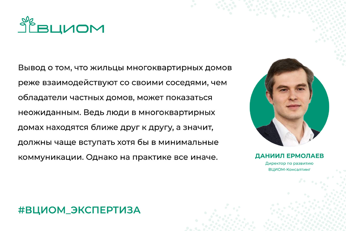 Тепло поздороваться или пройти мимо, даже не кивнув? Отношения с соседями все строят по-разному: кто-то десятилетиями живет в одном подъезде и не знает имен друг друга, а кто-то перекрестил и переженил всех по стояку. Впрочем, как выяснил ВЦИОМ, в частных домовладениях все иначе: 66% жителей ИЖС знают всех или большинство своих соседей, что почти в два раза больше показателя, отмеченного среди жителей «городских муравейников». Действительно, кто если не сосед поможет расчистить дорогу после снегопада и соберет консилиум над сломанным отопительным котлом? Как сегодня строятся взаимоотношения живущих рядом и насколько востребованы соседские центры, открываемые в городах России, — в комментарии директора по развитию «ВЦИОМ-Консалтинг» Даниила Ермолаева.