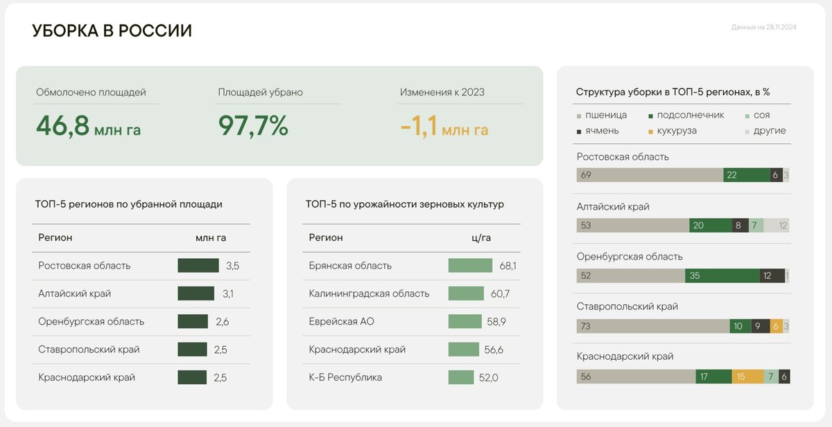 Общий валовый сбор зерновых на 29 ноября составил 133 млн т против 152 млн т годом ранее. Весной ряд ключевых регионов ЮФО и ЦФО пострадал от заморозков, летом – от засухи, а во время уборки (УФО, СФО) – от обильных осадков. Активный вывоз зерновых в начале сезона на фоне низкого урожая и слабого спроса со стороны основных покупателей пшеницы привел к тому, что Минсельхоз действительно срезал пошлину до уровня 11 млн тонн, как мы писали ранее, закрыв экспорт кукурузы и ячменя в период квотирования (с 15 февраля). Пока это никак не отразилось на уровне экспортных цен, пребывающих на низких уровнях. Спроса на декабрь практически нет. 🙂 84,6 млн тонн на старых территориях и 87,8 млн тонн всего. 300К га еще не обработано в СФО. Падение урожайности в Южной (39 ц/га против 45 ц/га) и Центральной полосе (38 ц/га против 48 ц/га) частично компенсировано ростом урожайности в Сибири (22 ц/га против 16 ц/га). 😐 Ситуация по ячменю схожа с пшеницей по региональной урожайности. По “старым территори