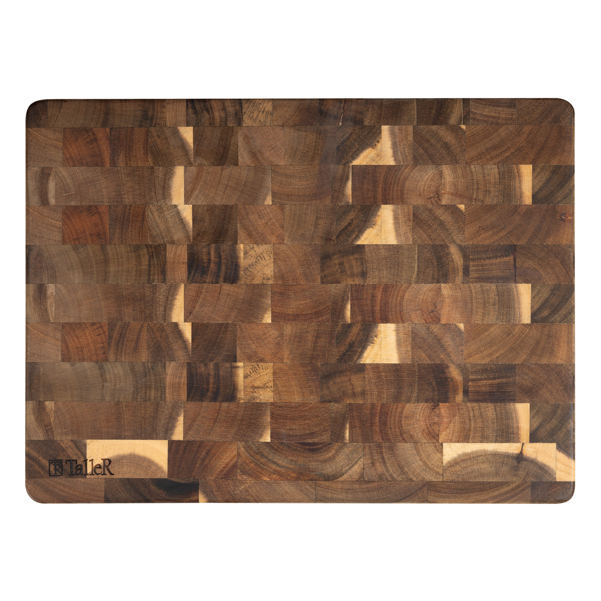 TalleR Professional Премиальная серия 🔸Размеры: 35 х 25 х 2,8 см. 🔸Доска выполнена из акации. 🔸Имеет две рабочие поверхности. 🔸Большая торцевая доска толщиной почти в три см. 🔸Вес доски 1,5 кг. 🔸Торцевые разделочные доски обладают более высокой износостойкостью, т.к. твёрдость волокон древесины на торцевой поверхности значительно выше, чем на боковой. 🔸Использование торцевой доски позволяет ножу двигаться вдоль волокон древесины, что предотвращает их поперечное рассечение и износ доски. 🔸Это также препятствует затуплению ножей и попаданию мелких частиц дерева в еду. 🔸В результате ножи медленнее тупятся, а срок службы доски значительно увеличивается. 🔸Для увеличения срока службы изделия рекомендуется периодический уход. 🔸Для этой цели в комплекте с доской идет масло из соевых бобов. - помойте и хорошо просушите доску - нанесите на доску масло, равномерно распределив его салфеткой по поверхности доски - дайте маслу впитаться в течение 15 минут, после чего уберите излишки масла