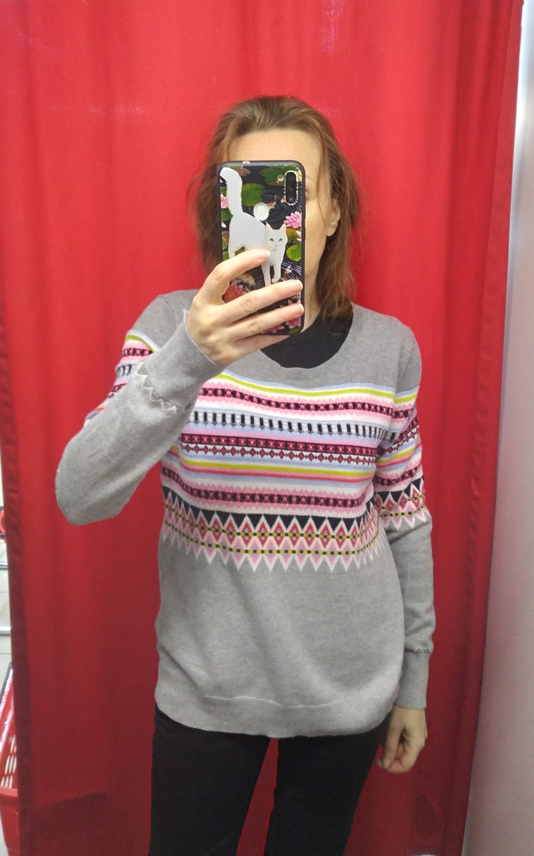 Здравствуйте, я обиделась на наш секонд, на тот который ближе всего к дому. Он подорожал: было 490 за кг, теперь 590 за кг. Всё-таки цена 490 более психологически приятная, за кг около пятисот рублей звучит не так страшно. Это как картошка, если она стоит менее 50 рублей я легко её ем, а если дороже, то застревает эта картошка у меня в горле, не лезет, знает себе цену и сопротивляется. Так и в секонде цена 590 за кг это звучит уже не как около 600 рублей, а все 600(( за ношеные вещи. 590 за кг. Светло-серый джемпер с ярким узором. Тонкий мягкий трикотаж. Из хлопка и синтетики. Бежевое платье с россыпью сердечек. Платье отрезное по талии, юбка не очень пышная, лиф застегивается на маленькие пуговицы, рукава 3/4 с широкими манжетами. Вискоза. Небольшая сумка ярко-красная с черной отделкой, застегивается на молнию. Прямое платье с короткими рукавами и v-образной горловиной. Похоже на синтетику, но просто понравился рисунок. Джинсы из довольно тонкой ткани, ширинка на молнии. Два в одном