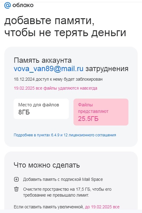 Приветствую друзья! На днях мне пришло письмо на электронную почту от Облако Mail.ru Раньше можно было хранить 25 ГБ, а теперь они бесплатно не хотят так много хранить, дают ограничения в 8 ГБ. Вот теперь надо куда-то прибрать 17-18 гигов файлов. Слова из которых состоит данное предложение выглядят лексически неправильно. Будто спам какой-то, который еще и криво переведен почтой.