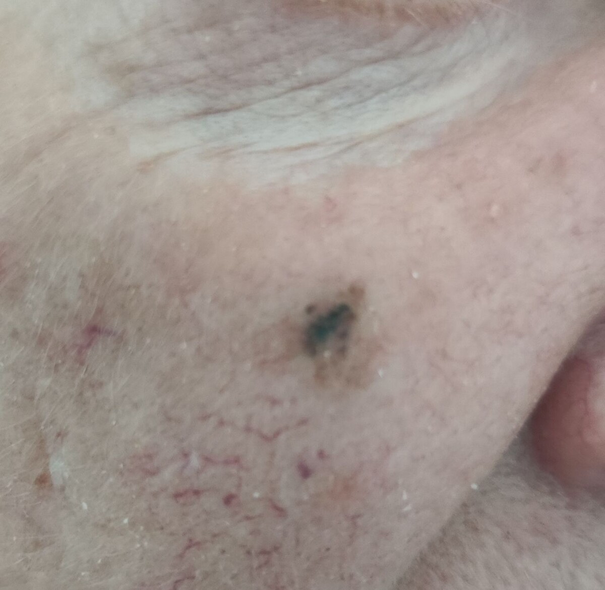 Пациентка, 70 лет, обратилась с жалобами на образование кожи правой щеки, которое существует уже более двух лет. Родинка не беспокоит, не болит, но в течение времени немного подросла. Здесь особенно сильно на себя обращает внимание цвет. На фотографии видно образование с ярко выраженным чёрным оттенком, который всегда должен настораживать.