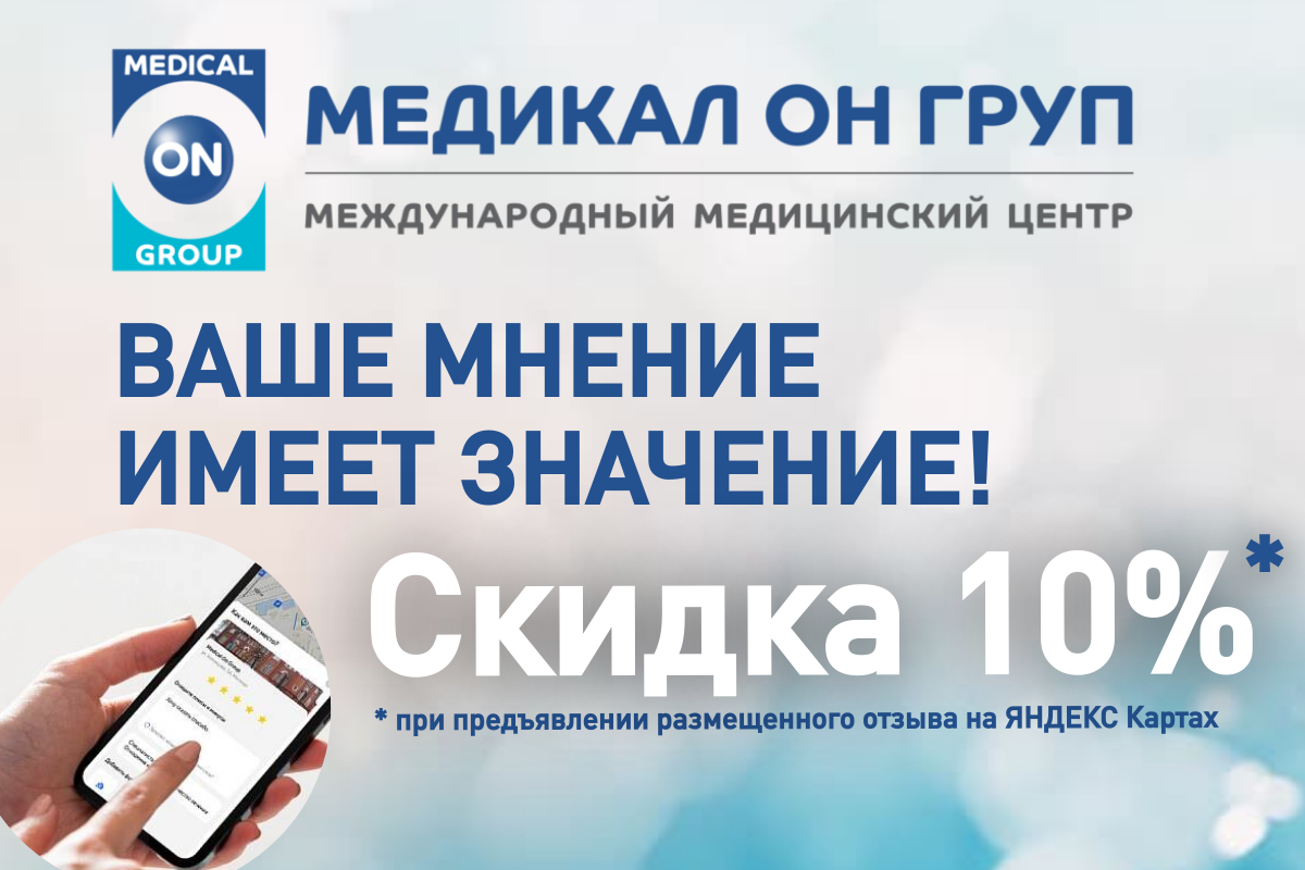 👍Друзья, напоминаем, что во всех клиниках нашей сети «Медикал Он Груп-Подмосковье» до конца года действует акция – скидка 10% за отзыв! 😇Ваше мнение имеет для нас огромное значение! Ваши отзывы, предложения и впечатления способствуют нашему развитию и совершенствованию, помогают создать максимально удобный сервис и обеспечить предоставление только качественных услуг. ➡️В знак благодарности дарим каждому нашему пациенту скидку в размере 10% на любой последующий прием специалиста при предъявлении размещенного отзыва на ЯНДЕКС Картах. ❤️Просто покажите нашему администратору ваш отзыв на платформе ЯНДЕКС Карты, и мы автоматически применим скидку. Скидка предоставляется на следующий прием после написания отзыва. 💻Помните, что рассказывая о своем опыте посещения клиники или о приеме у нашего специалиста, вы помогаете не только нам, но и другим пациентам сделать осознанный выбор в пользу качественного и доступного сервиса. Скажите «спасибо» своему врачу в 🥇Медикал Он Груп-Балашиха 🥇Мед