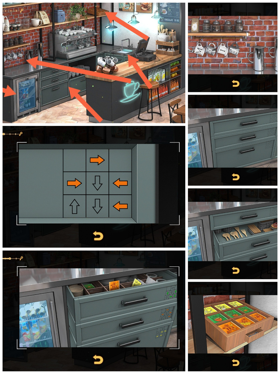 Прохождение игры Rooms & Exits Глава 1 У воров нет чести Уровень 4 Кафе Обновленная версия 2024г. Приступаем - Слева в маленьком холодильнике, с прозрачной дверью, берём банку газировки - Переходим выше, на крючка висят кружки, в них берём открывашку - В инвентаре, открываем банку открывашкой, получаем подсказку Жёлтые стрелки - Правее 3 ящика, жёлтая подсказка соответствует, нижнему Поворачиваем стрелки, как на подсказке, соответственно, с цветом и без - получаем подсказку, для среднего ящика - делаем так же, получим красный вентиль - Справа раковина с краном, наполненная водой, правее крана, применяем вентиль, вода уходит, получаем подсказку, для верхнего ящика - с помощью подсказки, открываем верхний ящик, получим 3 пакетика чая - Правее кофемашины, лоток с пакетика и чая, добавляем туда полученные из инвентаря Нужно собрать ряды, одинаковых по цвету Расположение рядов Верхний - желтый Средний - зеленый Нижний - оранжевый Видео прохождения по ссылке