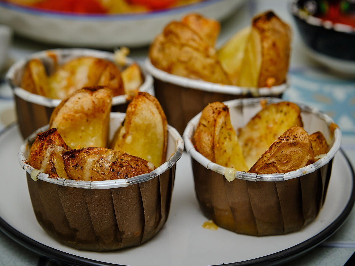 Мне безумно понравилась идея запекания картофеля в формочках по нескольким причинам. Во-первых, можно рассчитать по количеству гостей. Во-вторых, порция картофеля небольшая, можно легко избежать переедания, что особенно актуально за новогодний столом. Ингредиенты: Картофель Растительное масло Специи по вкусу Сыр Готовим: Картофель среднего размера хорошо вымыть, порезать на дольки. На этом этапе я обычно делаю заправку для картофеля из чеснока, растительного масла и любимых специй (соль, перец, паприка, травы). Хорошо обваливаю картофельные дольки в этом "маринаде". Выложить в каждую формочку дольки примерно по объёму одной, картофелины, 4-5 долек. Отправить запекать я в духовку до золотистой корочки. Сыр натереть на треке. Посыпать картофельные дольки и отправить на 5-7 минут, чтобы сыр расплавился. Подавать в формочках к любому виду мяча или рыбы, или в качестве основного блюда, дополнив различными соусами. Приятного аппетита! Другие рецепты кулинарного календаря смотри