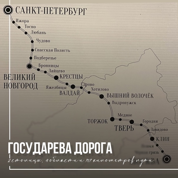 Сегодня расстояние от Москвы до Санкт-Петербурга можно преодолеть за пару часов, но всегда ли стоит выбирать автобан? Мы предлагаем по-новому взглянуть на самое популярное автонаправление и вспомнить, что когда-то дорога, идущая сегодня параллельно трассе М-11, назвалась «Государева дорога». Петербург еще не стал столицей, а Петр I уже велел строить сухопутную дорогу в Москву. Базой для будущей скоростной трассы послужил старинный путь в Великий Новгород. Первым пунктом на пути в новую столицу в петровское время стала подмосковная деревня Черная Грязь. Когда-то именно здесь москвичи прощались со своими близкими. Путешествие было не из легких и длилось около недели, некоторые провожающие видели здесь своих родных в последний раз. В 15 км от Солнечногорска, второй почтовой станции на Государевой дороге, и в 4 км от трассы М-10 находится родовая усадьба сподвижника Петра Великого - Василия Татищева в Болдино. Быстрее всех по императорскому тракту передвигались курьеры. Чтобы развивать мак