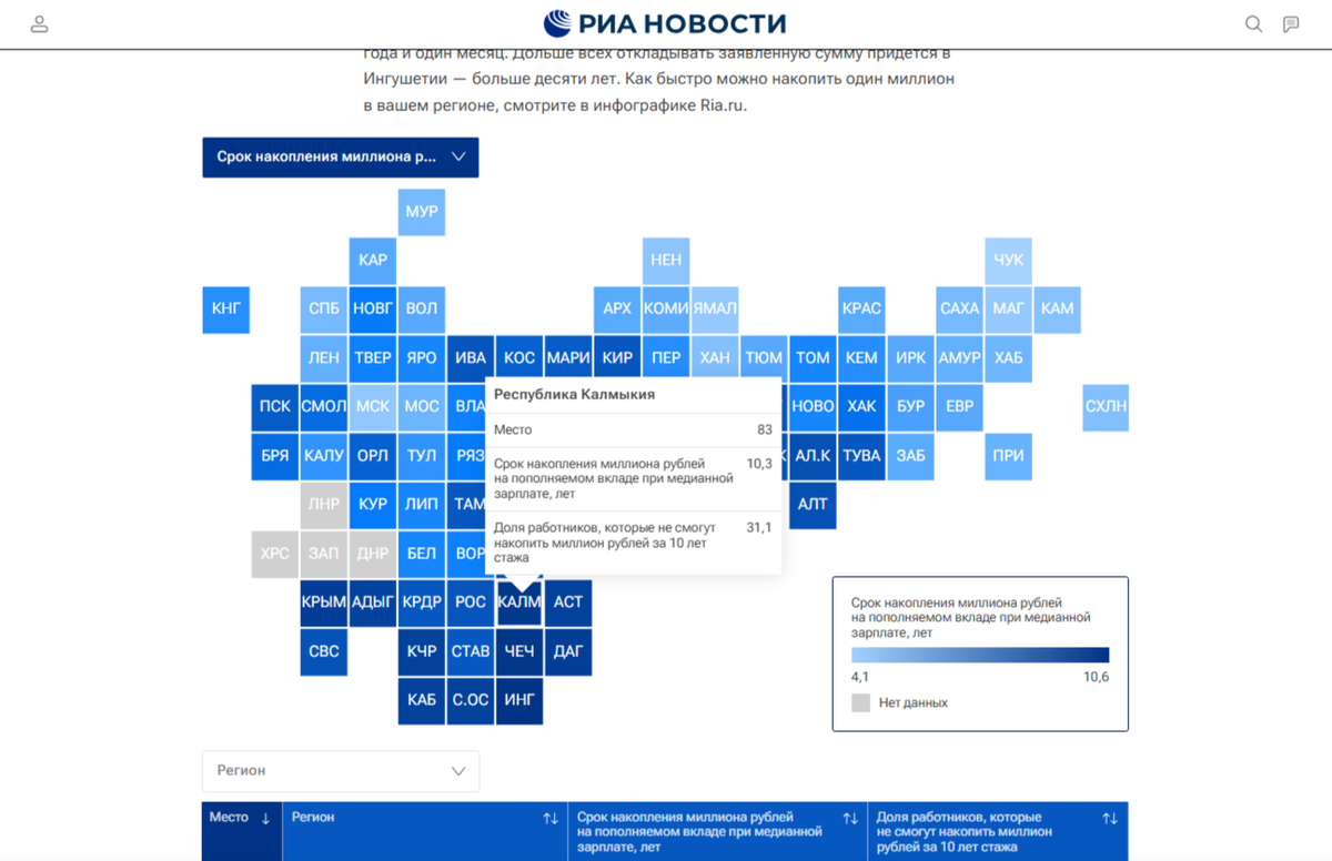 Инфографика РИА Новости наглядно показала, что лидером рейтинга среди регионов по скорости накопления миллиона стал Чукотский автономный округ. Здесь жители смогут собрать миллион рублей за четыре года и один месяц. Калмыкия занимает в рейтинге 83 место, срок накопления миллиона рублей на пополняемом вкладе при медианной зарплате 10 лет и три месяца. Доля работников, которые не смогут накопить миллион за десять лет и три месяца составляет 31,1%. Понравилась статья? Хотите быть в курсе всех новостей о налоговых льготах и бизнесе? Подписывайтесь на канал dzen.ru/officegarant и получайте актуальную информацию из первых рук!
