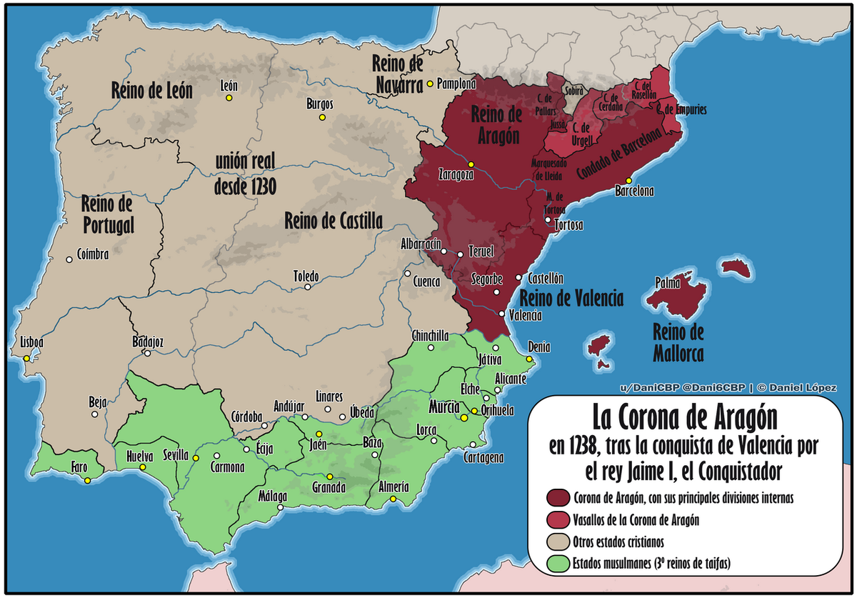В 1248 году, королю Хайме пришла в голову отличная мысль всех своих четырех сыновей сделать королями-наследниками. Ну, хоть не дочерей, помимо сыновей, как решил в свое время Саншу I Заселитель в Португалии. Дело усугубилось тем, что и сыновья у него были от разных жен. Еще в 1241 году Хайме составил завещание, согласно которому его первенец Альфонсо (1222-1260), единственный сын первой жены Элеоноры Кастильской (сестры Энрике I и тети Фернандо III, королей Кастилии) получает Арагон и Барселонское графство, а Педро, сын второй жены, Виоланте Венгерской (Арпад) - Валенсию, Балеарские острова, каталонские графства Руссильон и Сердань, а также небольшие сохранившие у Короны Арагона окситанские владения - главной из которых была сеньория Монпелье.