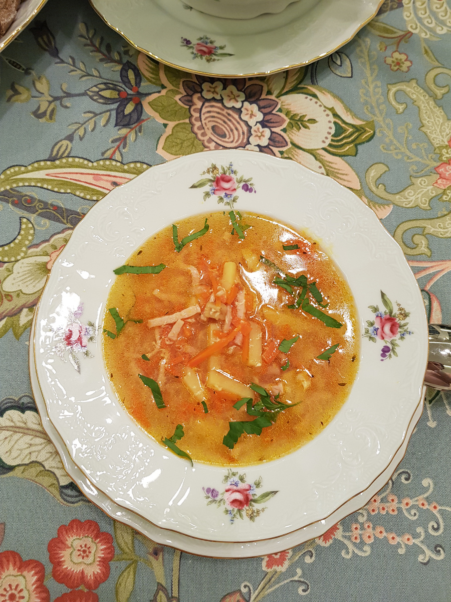 Добрый день, дорогие друзья! За окном в Сибири падает снег, а это значит, на улице достаточно тепло для русской зимы, и, чтобы оградить себя от простудных заболеваний, самое время приготовить чесночный суп. Сегодня я приготовила для вас Cesnaková polievka (Чесночный суп) по рецепту, которым со мной поделился Peter Kovylin, знаток, ценитель и производитель чешского фарфора. Для приготовления нам понадобятся: 500 грамм копченой корейки, 1 луковица, 1 морковка, 4 картофелины, 1 яйцо, 4 зубчика чеснока, 1,5 литра куриного бульона, 1 столовая ложка приправы из сушеных корней сельдерея, петрушки и пастернака, 1/2 чайной ложки соли, 2 столовые ложки подсолнечного масла. Приготовление: лук нарезать мелким кубиком, морковь, корейку и картофель нарезать соломкой. Разогреть растительное масло в стальной кастрюле и обжарить лук. Добавить к луку морковь. Добавить корейку. Добавить сельдерей, петрушку, пастернак. Всё перемешать и обжаривать в течение 5 минут. Добавить в кастрюлю горячий бульон. По