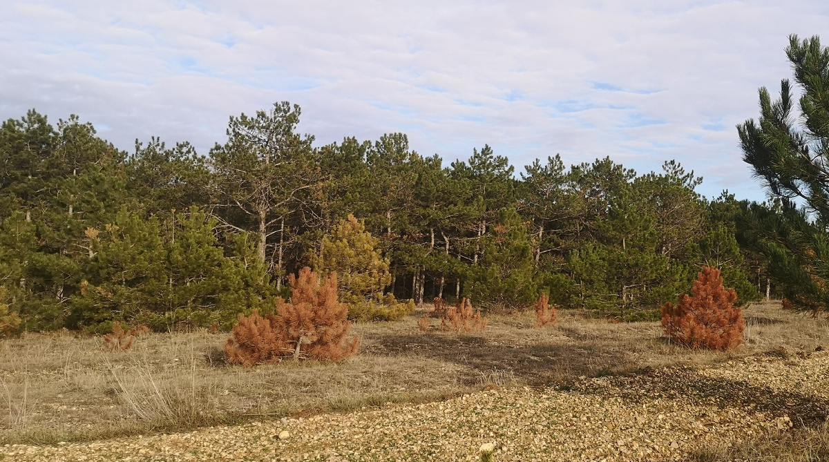 В этом году грибной не урожай, в нашем краю их не то, чтобы мало, их вообще нет практически! Местами степняки встречаются по несколько штук и все. Да, я знаю, что в горах грибы есть, но это все равно не то количество, как бывает обычно и я только сегодня это поняла. Решила я поработав с утра сходить в лес. Думаю, ну, хоть кулечек небольшой соберу к Новому году, на большой урожай и не рассчитывала. Чтобы быть наверняка с грибами, пошли с Бирмой в дальнее грибное место, где грибы были всегда! Когда больше, когда меньше, но всегда. По пути стали бросаться в глаза группы высохших сосен Сушняка было очень много, это меня, често говоря, поразило. Я давно такого у нас не наблюдала. Большие деревья тоже пятнами сохли Эта сосенка, что в середине виднеется, только начала желтеть Обычно в жаркое лето у нас сохнут туи и ели, именно они не особо приспособление к жаре, но сосна на то и крымская, поэтому все невзгоды переносит хорошо. Но, видимо, не в этот год. Сухостоя тоже в лесу много, но его