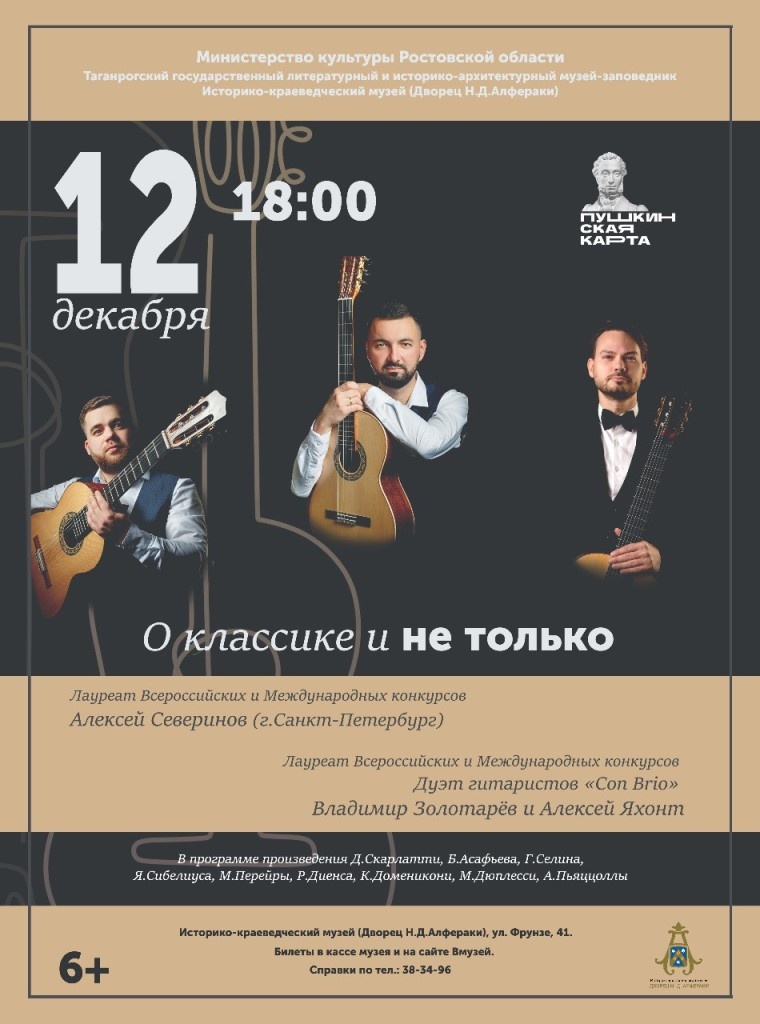 В двусветном зале Дворца Алфераки Таганрога в программе историко-музыкального вечера «О классике и не только» выступят гости нашего города – гитаристы Алексей Северинов, Владимир Золотарев и Алексей Яхонт. Произведения выдающихся зарубежных и отечественных композиторов XVIII–XXI веков исполнит лауреат первых премий на престижных конкурсах исполнителей гитарный дуэт «Con Brio». Участники ансамбля – заслуженный деятель Всероссийского музыкального общества, преподаватель Ростовского колледжа искусств по классу классической гитары Владимир Золотарев и заведующий отделом народных инструментов ДМШ им. М.М. Ипполитова-Иванова Алексей Яхонт. Авторские произведения и переложения для гитары исполнит лауреат международных и всероссийских конкурсов, автор и ведущий проекта «Ступени мастерства», преподаватель по классу классической гитары в Детской музыкальной школы №17 им. А.Г. Рубинштейна (Петергоф) и старший преподаватель кафедры музыкальных дисциплин Ленинградского государственного университета