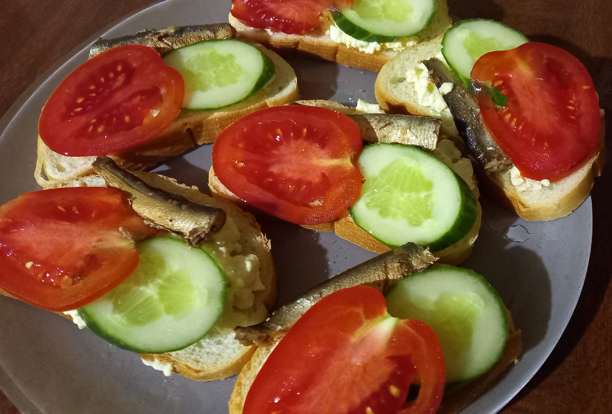 Вареные яйца мелко нарезаем и добавляем майонез. Перемешиваем. Смазываем яичной смесью ломтики батона. Выкладываем на них дольку огурца и дольку помидора. Сверху кладем одну рыбку. Украшаем зеленью. Так делаем все бутерброды.