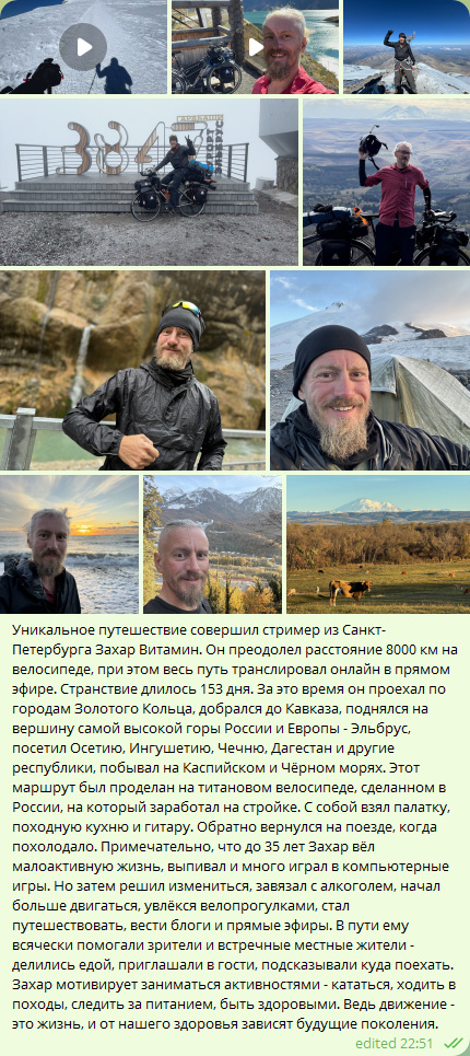 Всем привет! Это пост-опровержение. Кто не знает, я — Захар, стример велопутешественник (это значит, что свои путешествия на велосипеде я транслирую в прямом эфире). В 2024 году я совершил уникальное путешествие. Преодолел расстояние 8000 км на велосипеде, при этом весь путь транслировал онлайн в прямом эфире. Странствие длилось 153 дня. За это время проехал по городам Золотого Кольца, добрался до Кавказа, поднялся на вершину самой высокой горы России и Европы - Эльбрус, посетил Осетию, Ингушетию, Чечню, Дагестан и другие республики, побывал на Каспийском и Чёрном морях. Всё это транслировал онлайн на Твиче и других стриминговых платформах, также писал посты на Пикабу, выкладывал фото и видео в телеграм канал. Решил заявить об этом миру, чтобы больше людей узнали о том как круто вести активную жизнь, и какой личностный рост дают путешествия. Для этого я написал краткую статью и предложил в различные СМИ. Вот так выглядела моя статья: К статье приложил короткий видеоролик: И видео из Да