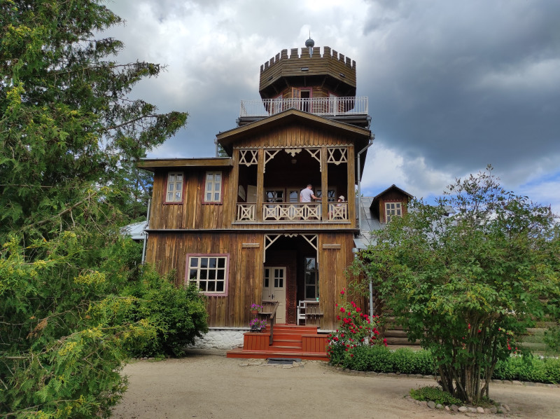 Само здание усадьбы, к сожалению, не оригинальное - в советское время местные растащили его на дрова. Усадебный дом был воссоздан по рисункам и фотографиям в 1988 г., однако сгорел в 1995 году. Нынешнее здание - повторная реплика 2000 года. На территории парка вокруг усадьбы расставлены таблички с высказываниями Репина о жизни в Здравнево: Памятник художнику. По-моему, очень удачный: Западная Двина здесь широка и живописна. Но во времена Репина так не было - сегодня река искусственно расширена: Живя в Здравнево, Репин водил знакомство с витебскими западнорусистами Сапуновым