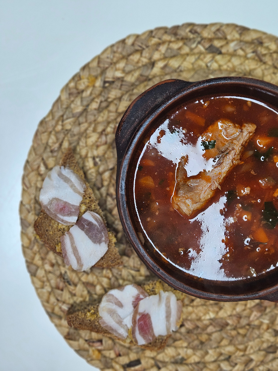 Борщ это когда не суп и не овощное рагу, а оба этих компонента сведенных в одном в нечто абсолютное, шедевральное и понятное совершенно каждому соотечественнику. Мужицкий борщ от борща женского отличает ровно одна особенность. Густота. В мужском ложка должна стоять. Если не стоит, не расстраивайтесь, в следующий раз обязательно получится. Если не будет стоять в следующий раз, ложка, стоит призадуматься. О жизни. В остальном полная свобода действий. Можно делать на мясном, овощном, водопроводном бульонах, с печеной свеклой, вареной, сырой, кривой и косой, пампушками, галушками, валентинками, хохотушками. Лично я делаю так: Начинаем с бульона, а пока он варится сделаем нарезки и зажарку. Бульон всему голова Как-то режем ребра, кусками размером с рот говядину, ложим это дело в толстостенную кастрюлю с водой, добавляем один целый ОЧИЩЕННЫЙ лук, одну целую ОЧИЩЕННУЮ морковь, пригоршню душистого перца горошком и лавр. Доводим до кипения, снимаем пену, ставим на медленный огонь и ВАРИМ 3