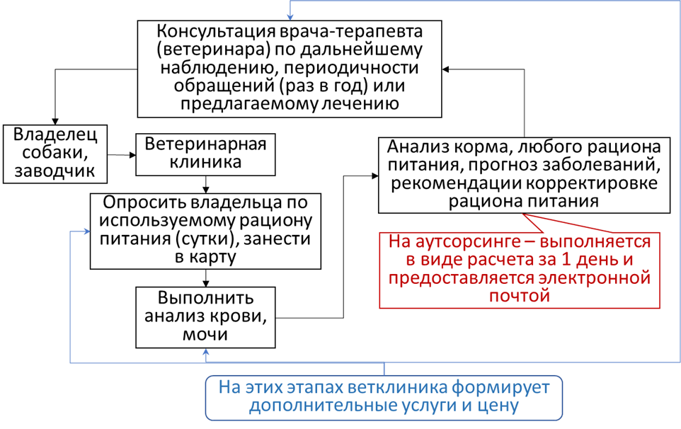Предлагается сотрудничество ветеринарным клиникам на предмет развития предоставляемых пациентам и их питомцам услуг. Ниже дана схема взаимодействия. В основе предложения лежит авторская методика анализа рационов питания (включая сухие корма) собак, кошек, возможно и человека. Эта область знаний из зоотехнии, т.е. дисциплины о содержании, развитии, питании и селекции животных. Результаты разработки методики защищались ранее в Смоленской сельхозакадемии и готовятся к защите в Тимирязевской академии в Москве. На данный момент методика не имеет аналогов в мире. Познакомиться с результатами оценки кормов можно на странице авторов https://dzen.ru/id/6749dc74547f617349cd2028. Особо отметим, что рекомендации предлагаются для здоровых собак, щенков, служебных собак, спортивных и т.д., т.е. на предмет профилактики заболеваний или подготовки собак к особо интенсивной жизни, выставочной работе, включая тщательный уход за шкурой. У авторов есть статьи относительно используемых рационов питания для