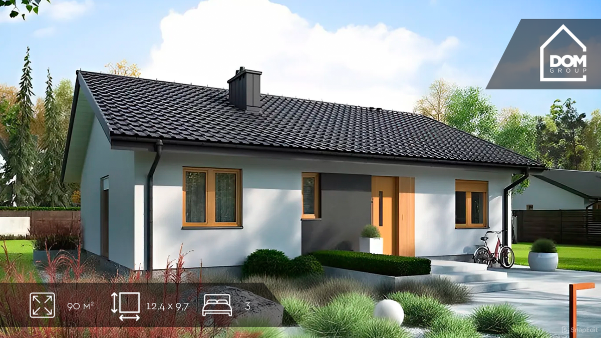 Хотите построить стильный и ликвидный одноэтажный дом? Мы собрали для вас подборку наших самых популярных проектов для семьи из 3-4 человек, которые точно вам понравятся! - Общая площадь - 90 м2 - Габариты дома - 12,4 x 9,7 м - Кол-во спален - 3 шт В 90 квадратных метрах разместилось все самое необходимое для семьи из 3-4 человек: - 3 спальни