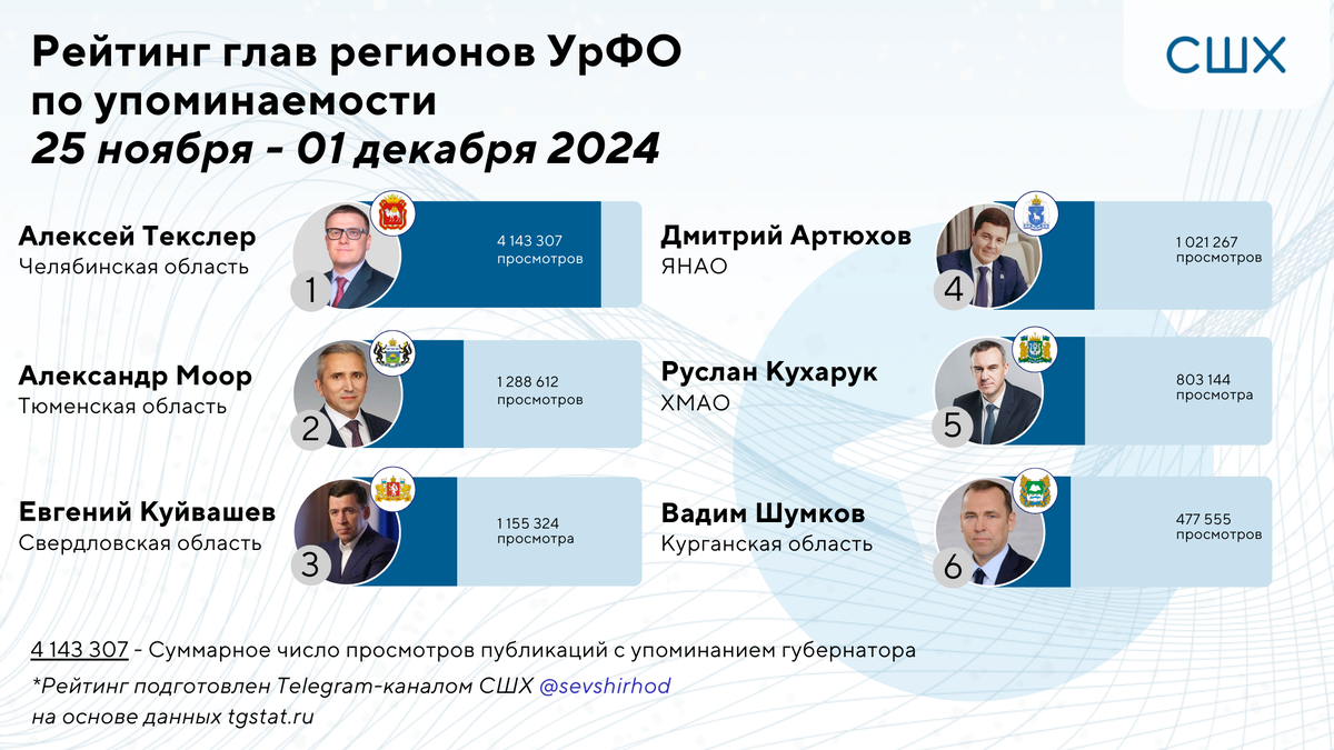 Губернатор Челябинской области Алексей Текслер вновь занимает первое место с 4 143 307 просмотрами и 1 726 на фоне негативных событий. В этот раз — пьяный водитель BMW X6 влетел на перекрестке в пешеходов. Пострадали пятеро, включая младенца. Жесткую оценку резонансу оперативно дал сам губернатор.