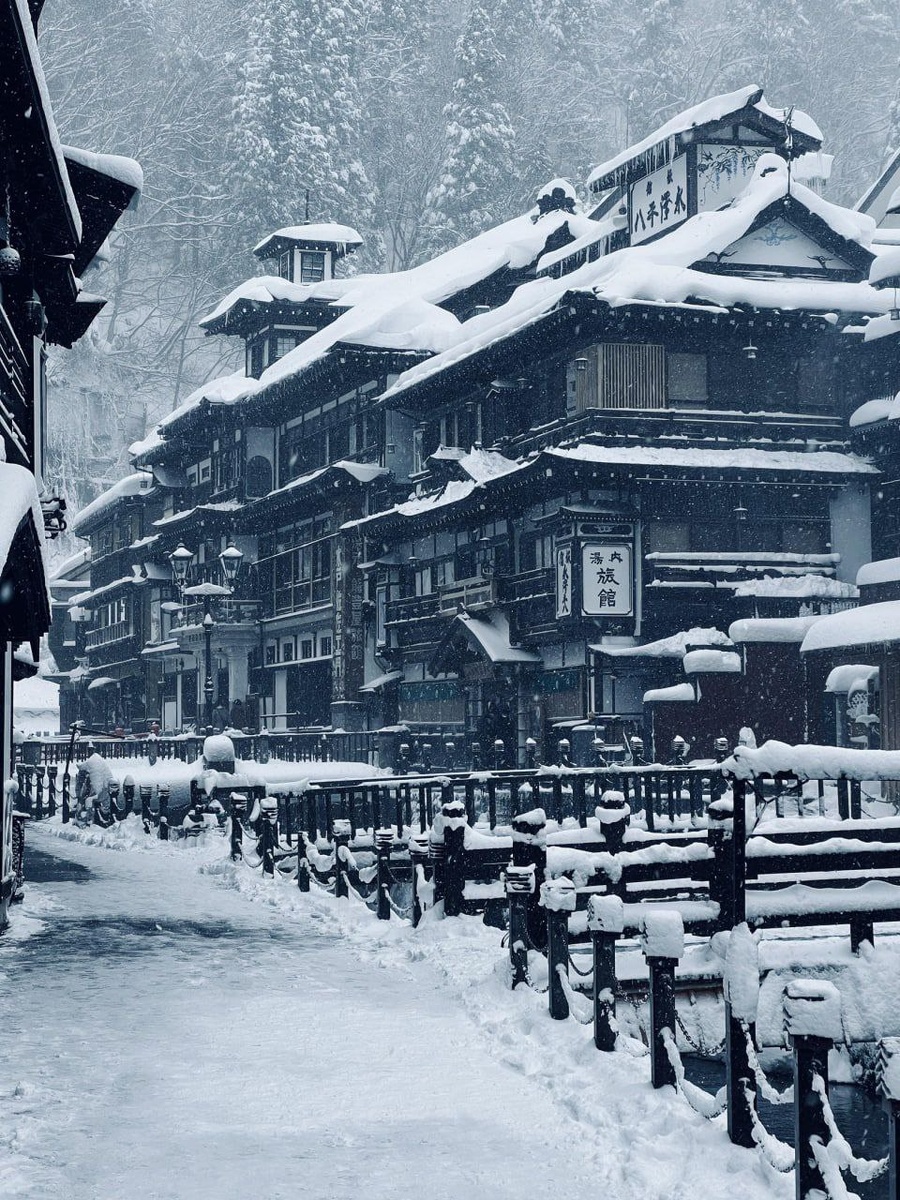 На фото сказочный город Гинзан Онсэн (銀山温泉), находящийся в префектуре Ямагата Гинзан Онсэн (銀温泉温泉) - это район онсэн (горячие источники) в Обанадзаве, префектура Ямагата, Япония. Его название означает "горячий источник серебряного рудника". Экономика Гинзан Онсена выросла за счет добычи серебра и, в конечном итоге, перешла к туризму, когда были открыты десятки курортов с горячими источниками и рекан вдоль центральной реки, протекающей через город. В горах, окружающих этот город, есть богатая горячая родниковая вода, которая используется как в частных отелях, так и в общественных банях в центре города. Центр города - район только для пешеходов. С наступлением темноты мосты и улицы освещаются газовыми фонарями. Зимой в Гинзан-Онсен выпадает сильный снег. На дальней стороне города с гор недалеко от старого серебряного рудника Нобесава Гинзан спускается 22-футовый водопад Широгане-но-Таки[3].[4][1] На международном уровне в этом городе наблюдается резкий рост иностранного туризма благода