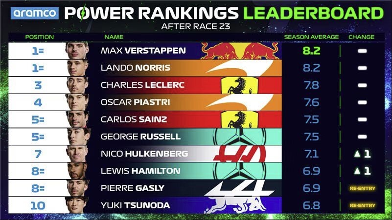 По итогам каждого гоночного уик-энда пять экспертов официального сайта «Формулы-1» выставляют всем гонщикам оценки по 10-балльной шкале. Итоговой оценкой каждого пилота становится среднее получившееся значение. За этап в Катаре наиболее высокую оценку среди участников (9,2 балла) получил выигравший гонку Макс Ферстаппен («Ред Булл». Второе место в рейтинге занял пилот «Альпин» Пьер Гасли (8,8 балла), закончивший заезд на пятой позиции. Третьим стал гонщик «Заубера» Чжоу Гуаньюй (8,4 балла) Рейтинг пилотов Гран-при Катара по версии экспертов сайта «Ф-1» 1. Макс Ферстаппен («Ред Булл») – 9,2 2. Пьер Гасли («Альпин») – 8,8 3. Чжоу Гуаньюй («Заубер») – 8,4 4. Кевин Магнуссен («Хаас») – 8,0 5. Шарль Леклер («Феррари») – 7,8 5. Джордж Расселл («Мерседес») – 7,8 5. Фернандо Алонсо («Астон Мартин») – 7,8 8. Карлос Сайнс («Феррари») – 7,2 8. Оскар Пиастри («Макларен») – 7,2 10. Валттери Боттас («Заубер») – 7,0 В общем зачете рейтинга Макс Ферстаппен догнал Ландо Норриса и гонщики делят первое м