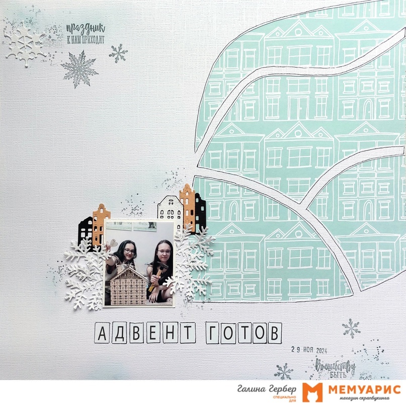 Не все умеют работать со скетчами Мемуарис многие впадают в ступор. Какие-то заковыристые они у нас! - частенько слышим мы от наших подписчиков. Ловите предложение от нашего дизайнера: нет идей, повторяй точь-в-точь! Ну или максимально похоже. Всем привет! С вами Галя. Сегодня буду вдохновлять вас на работу с нашим скетчем. Я сделала страничку, руководствуясь расположением элементов на первоисточнике. Подготовила основу из белого кардстока, перевела нужный силуэт с помощью офисного листа бумаги по светящемуся монитору, получив при этом нужный мне трафарет. Буквы для заголовка взяла с листа с алфавитом (бережно храню такие раритеты, использую в исключительных случаях). Чтобы максимально было похоже на скетч, приклеенные буквы обвела чёрной гелевой ручкой. Также поступила и с изогнутыми линиями. Постаралась подобрать точно такие же элементы, как на скетче. Повторила идею с домиками, кленовые листочки заменила на еловые веточки (всё-таки уже зима). В деле сеты Мимикат: «Под ёлочкой скака