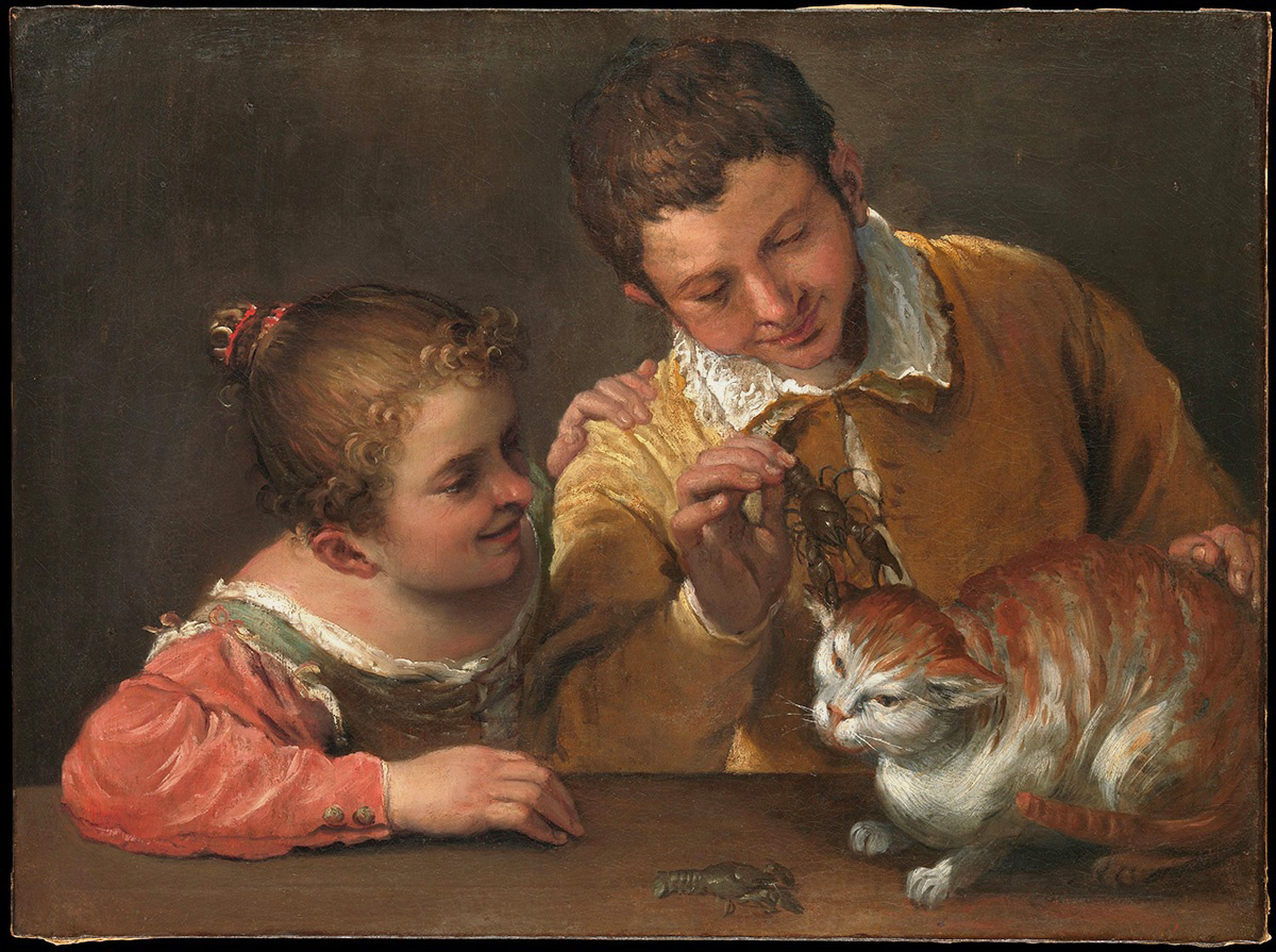 Среди наиболее новаторских работ конца XVI века есть небольшая группа картин на повседневные темы, созданных в академии семьи Карраччи в Болонье. Авторство этих работ установить сложно, поскольку они были написаны художниками-родственниками, нередко работающими с одними и теми же моделями. Эта необычная картина традиционно приписывается самому младшему из Карраччи, Аннибале (1560-1609). Однако каллиграфический рисунок кисти на воротнике рубашки мальчика, напоминающий работы Паоло Веронезе (1528-1588), по-видимому, подтверждает принадлежность авторства его брату Агостино (1557-1602). Кроме того, композиция схожая с данной и приписываемая Агостино, указана в описи 1680 года коллекций Фарнезе в Парме. Вне зависимости от её авторства, картину обычно датируют примерно 1590 годом, после одного из визитов Агостино в Венецию. Тема детей, дразнящих кошек, без сомнений, несла в себе некий нравственный посыл. Но всё же главным достоинством картины была возможность показать случайное и незначит