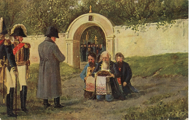 В декабрьском номере «Русской старины» за упоминаемый 1908 год была опубликована статья А.Н. Сергеева «Присяга Наполеону и моление за него в Могилевской епархии». Имеется в виду архиепископ Варлаам (Шишацкий), присягнувший на верность французскому императору после взятия Могилева. За ним последовало две трети его епархии. Французского завоевателя начали поминать на литургии. После освобождения города по личному указанию Александра I Синод рассмотрел дело Варлаама и принял решение об низвержении его из сана. Священников оставили при своих местах, только наложили епитимью. Факт, конечно, из ряда вон выходящий. Но в то же время были случаи, когда священники проявляли подлинный героизм на полях сражений, воодушевляя солдат, шли вместе с ними с крестом в руках в первых рядах, под пули, которые, как известно, не разбирают, кто ты. За конкретными примерами можно обратиться хотя бы к недавно вышедшей книге Дмитрия Петерса «Памятники фалеристики о подвигах и отличных деяниях россиян в борении с Наполеоном» (М., 2012).