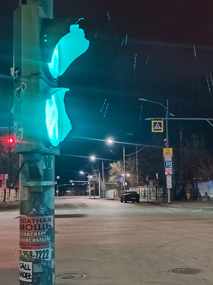 Как-то ночью я гулял по городу и фотографировал пустые улицы на телефон. После просмотра фото, я заметил одну интересную вещь: Освещенная зеленым светом светофора снежинка оставила свой трек (траекторию) на цифровом снимке. Импульс был прерывистый, что подсказало мне о том, что типичного светофора в обычном городе нет конденсатора, сглаживающего пульсации напряжения на лампах. Сразу же возникло желание посчитать длительность импульсов, пауз и проверить частоту работы светофора.. По ГОСТу частота питания соответствует 50 Гц. И это действительно подтверждается после простых расчетов. Ещё одним интересным моментом является факт наличия диодного моста после напряжения питания. Ведь именно из-за него частота удваивается. Вот она, ребята, физика вокруг нас.
