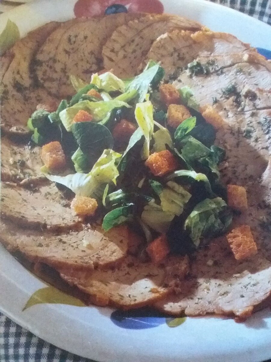 Свинину или телятину лучше запекать или тушить большим куском. Тогда она получится более сочной и мягкой. Вам потребуется на 4 порции: 3 кусочка белого хлеба 30 г сливочного масла 7 ст. л. растительного масла 125 мл бульона по 1 ч. л. мелко нарезанного тимьяна и розмарина 2 ст. л. оливкового масла 1 шт. лука шалота 2 ст. л. ароматизированного уксуса 1 ч. л. красного винного уксуса 1 ч. л.красного портвейна соль молотый черный перец 100 г зеленого салата 1 кг телятины 4 ст. л. растительного масла 125 мл бульона 125 мл сухого вина -Мясо натереть со всех сторон со лью и черным перцем и обжарить в 4 ст. л. растительного масла. За- тем накрыть крышкой и тушить на среднем огне в течение 1 часа 30 ми нут. При этом периодически подли вать 125 мл бульона и сухого вина. Дать остыть в бульоне. -Хлеб, срезав корки, нарезать кубиками. В сковороде разогреть 2 ст. л. растительного масла, доба- вить сливочное масло и обжарить хлеб при постоянном помешивании до золотисто-коричневого цвета. -Разогреть
