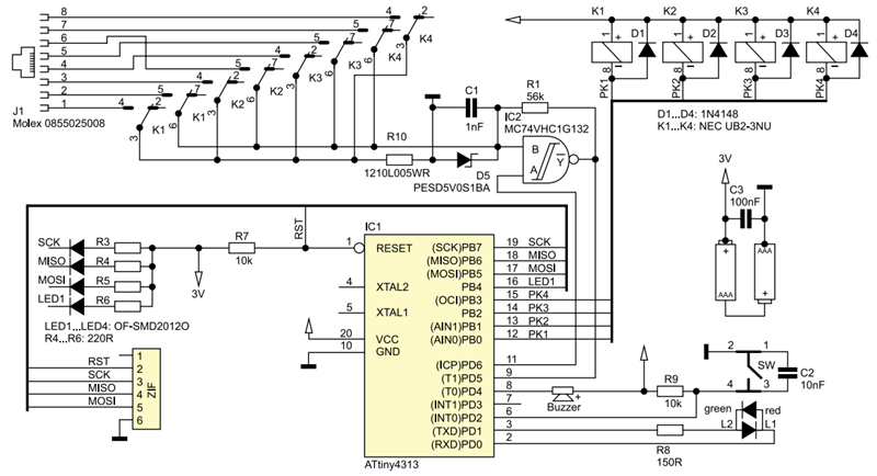 Результирующий код программы после компиляции составляет примерно 1,45 КБ, поэтому можно с успехом использовать микроконтроллер ATtiny2313.