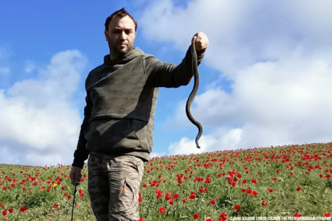 Привет, мои дорогие любители необычной земной фауны. Сегодня у нас специальный выпуск, посвящённый змее, которую вы все знаете, с одной стороны, но мало что знаете о её образе жизни, с другой. Взгляните на это фото. На нём изображён экземпляр зрелой степной гадюки (Vipera renardi) и ещё один довольно упитанный змей, относящийся (предположительно) к виду человек разумный (Homo sapiens). Вы спросите: "Почему предположительно?" Потому, что есть некие сомнения по поводу того, достоин ли он своего видового названия sapiens – разумный. Попробуем разобраться. В миру этого персонажа зовут Яков Осканов и населяет он преимущественно Ростовскую область, хотя имеет довольно широкий ареал и изредка может встречаться в пределах всей страны, и даже на других континентах. По натуре своей всеяден, но избегает гречку, окрошку, варёные яйца, молоко и салат оливье. При этом может употреблять в пищу лягушек, насекомых и змей, которых обычно не употребляет большинство представителей его рода. Детей любит, н