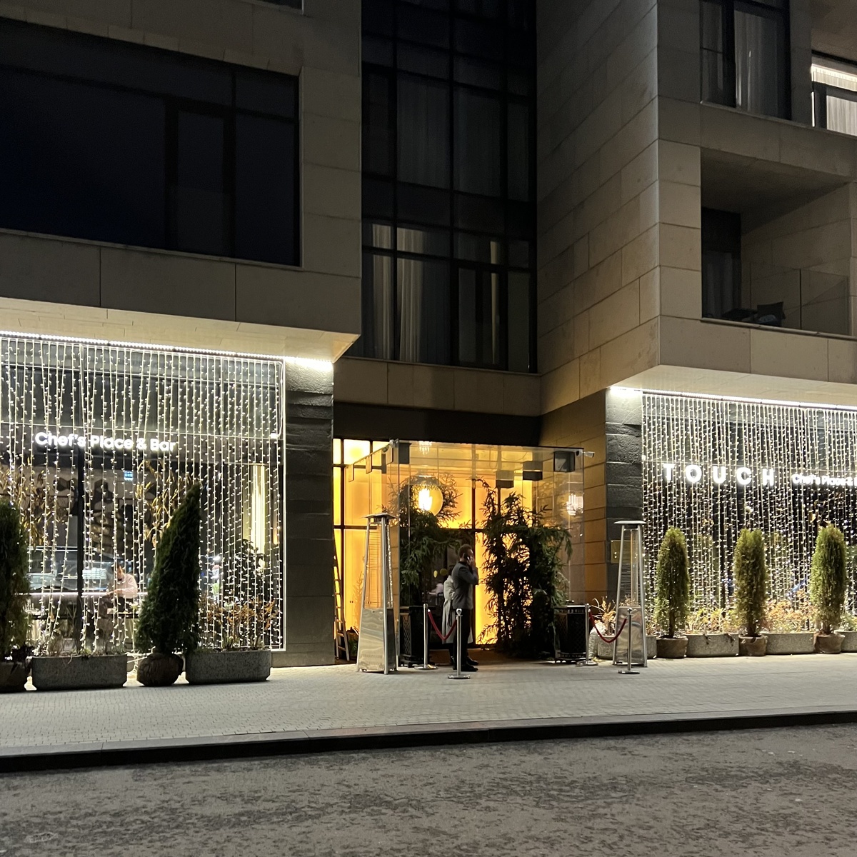 Ресторан Touch Chef’s Place & Bar появился летом 2021 года в разгар ажиотажа по поводу прихода в Москву красного гида «Мишлен». Находится данное заведение на Садовнической набережной рядом с Пятницкой, на первом этаже дорогого новостроя в огнях и камне. Вход красивый: большая арка, большая белая вывеска, размашистые двери, фойе с гардеробом и стойка приветствия рядом с баром в черно-серых тонах.