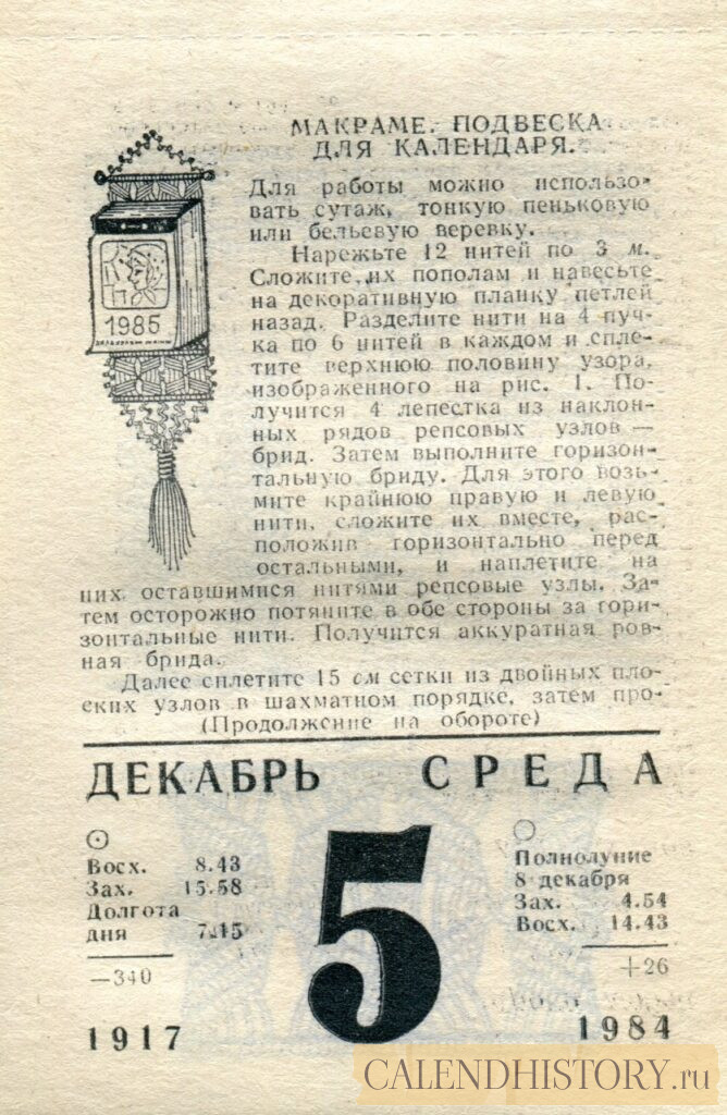 Итак, сегодня 5-го декабря и у нас на календаре 1984-й год. Перед нами листок советского календаря для женщин за этот день. На календаре у нас среда - 5 декабря 1984-го года. МАКРАМЕ. ПОДВЕСКА. ДЛЯ КАЛЕНДАРЯ. Для работы можно использовать сутаж, тонкую пеньковую или бельевую веревку. Нарежьте 12 нитей по 3 м. Сложите их пополам и навесьте, на декоративную планку петлей назад. Разделите нити на 4 пучка по 6 нитей в каждом и сплетите верхнюю половину узора, изображенного на рис. 1. Получится 4 лепестка из наклонных рядов репсовых узлов — брид. Затем выполните горизонтальную бриду. Для этого возьмите крайнюю правую и левую нити, сложите их вместе, расположив горизонтально перед остальными, и наплетите на