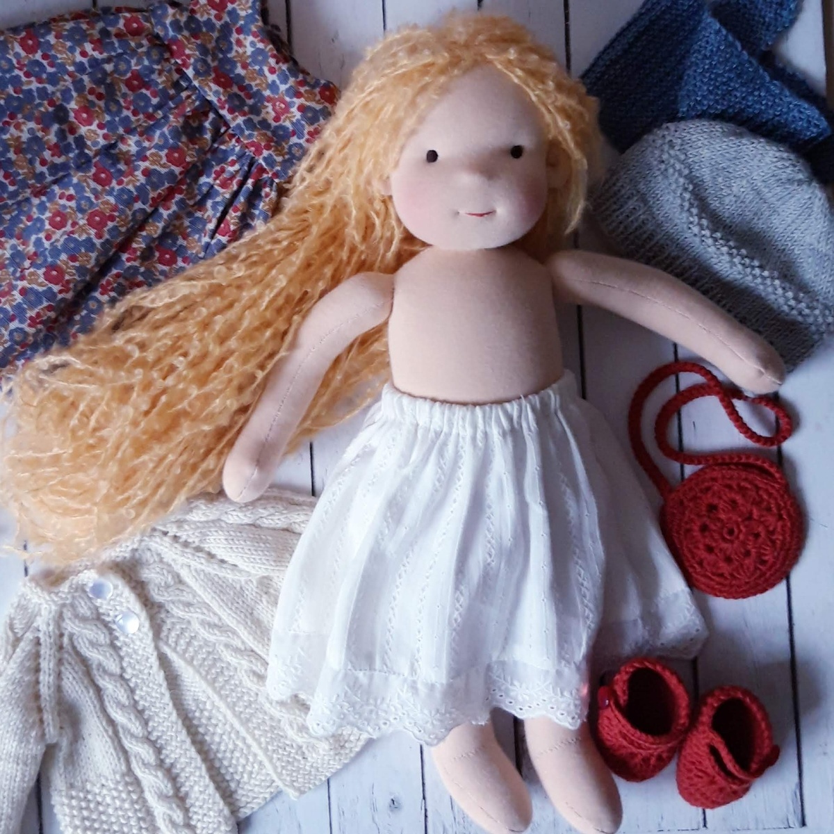 Свои куклам я обычно шью и вяжу полный комплект одежды. Это - платье, панталоны, кофточка, шарф, шапка, туфли и даже варежки. Вальдорфские куклы - это игровые куклы, поэтому вся одежда у куколки легко снимается и надевается. Когда ребёнок переодевает куклу, у него развивается мелкая моторика, дети учатся подбирать наряд для куколки, при этом можно просить ребёнка одеть куклу "по погоде". Платье и панталоны я шью из тонких хлопковых тканей. Для вязаной одежды использую пряжу из мериносовой шерсти или хлопка. Для платья хорошо подходят ткани с мелким не ярким принтом, для отделки можно использовать тонкое хлопковое кружево. В видеокурс по пошиву куклы включены мои мастер-классы по пошиву платья, панталонов и вязанию кофточки, шарфа, туфель и шапочки. Узнать подробнее о Мк по одежде для куклы можно в моей группе В контакте по ссылке