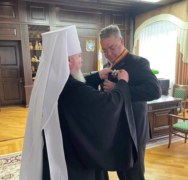 Митрополит Ставропольский и Невинномысский Кирилл вручил губернатору Ставрополья Владимиру Владимирову орден благоверного князя Даниила Московского II степени. Патриаршей награды глава региона удостоен за содействие Ставропольской епархии, сообщили в пресс-службе митрополии. В церемонии награждения принял участие епископ Георгиевский и Прасковейский Николай. Губернатор познакомился с новым правящим архиереем Георгиевской и Прасковейской епархии, который в свою очередь подарил ему икону Божией Матери «Всецарица». Участники встречи обсудили реализацию совместных проектов в сферах социального служения, образования, развития православной культуры и воспитания молодёжи.