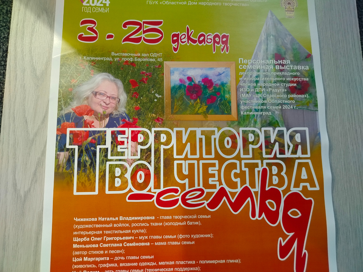 Сегодня группа краеведов из дома ветеранов посетила выставку творческой семьи, главой которой является Чижекова Наталья Владимировна. Выставка приурочена к году семьи. Зрительской аудитории представлены работы четырех поколений семьи в возрастных границах от трех до восьмидесяти семи лет. Выставка произвела на нас очень приятное впечатление. Игрушки, модные аксессуары, удивительной красоты фотографии природы, одежда из натурального шелка и художественного войлока, горячий и холодный батик, вечерние платья, экопринт, графика и невесомый палантин в нежнейших тонах - вот то, что привело нас в восторг. Текст подготовлен Натальей Юрьевой, руководителем кружка "Краеведения" Дома ветеранов г,Калининграда